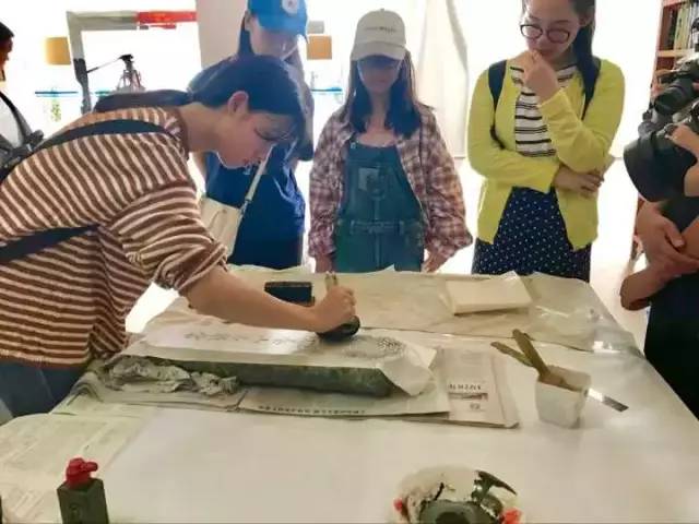 碑刻拓片,这一今年新加入的项目,是本次活动的亮点。活动于当天下午14:30开始。碑刻拓片传承人王赞成老师的制作课堂,位于图书馆大门正对面的一楼大厅。课堂体验主要是砖雕、瓦当、石雕三种拓片制作。经过王赞成老师的步骤示范,学生们分成每组7-9人的小组。利用宣纸、拓刷、拓包等工具,拓印出石碑纹理的起伏、石雕版上鸟雀的羽翎、砖雕上菩萨神秘的小胡子……宣纸的张张减少,随之而来的是同学们的手工制作也渐入佳境,完成的作品愈来愈精致啦!