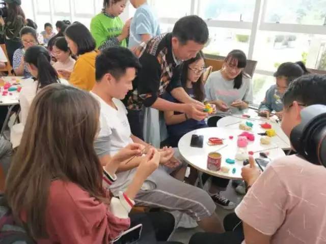 妆糕人课堂,在图书馆一楼大厅的门禁机一侧。指导老师是妆糕人泉州市级非物质文化遗产传承人张明铁先生。每两三张圆桌簇拥在一起,师生分别围坐其四周,简单的彩色面团在大家经手后,变成了扛着九齿钉耙的猪八戒、穿着裙子的小猪佩奇、活泼可爱的海绵宝宝、憨态可掬的天线宝宝……来自各类卡通影视里的的人物形象都齐聚一堂啦!
