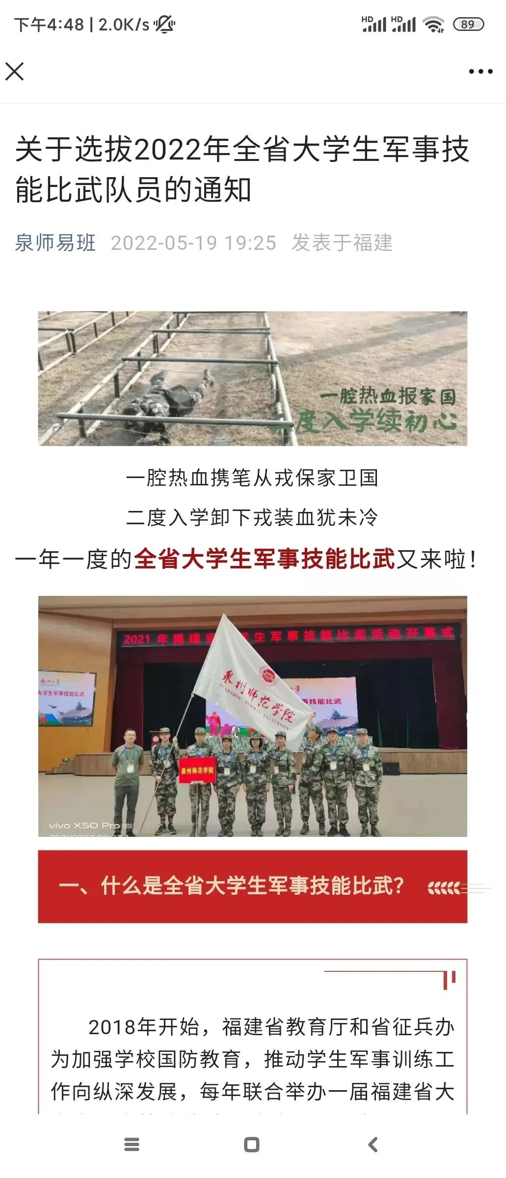 为参加2022年福建省大学生军事技能比武活动,本社团于2022年6月展开参赛选手选拔工作,经过两轮校内选拔赛,后续科学训练,全力保障,并于2022年7月在仰恩大学参加比赛,我校代表队在比赛中表现优异,荣获手榴弹定点投掷单项一等奖、电磁频谱管控单项三等奖,团体三等奖。