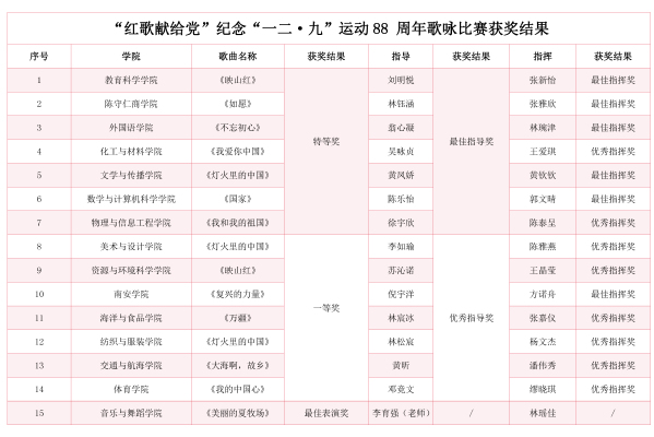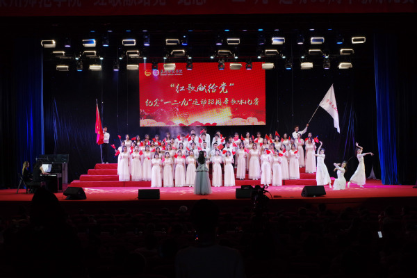 12月7日下午,我校举行“红歌献给党”纪念“一二·九”运动88周年歌咏比赛。校领导柯瑞清、陈晓风、陈明森,相关职能部门负责人,各二级学院党委(党总支)书记、副书记、团委负责人,师生代表近1300人参加活动。