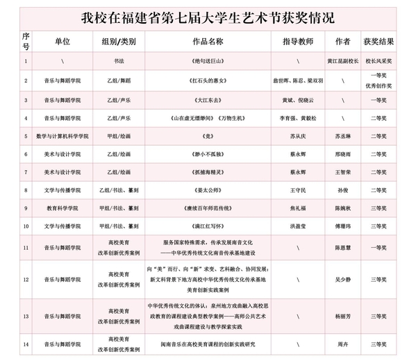 近日,由福建省教育厅主办的福建省第七届大学生艺术节展演活动圆满落幕。我校获校长风采奖1项、优秀创作奖1项、一等奖3项、二等奖5项、三等奖5项,学校获优秀组织奖。
