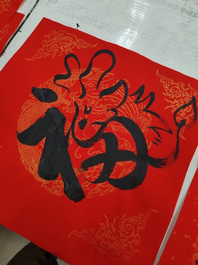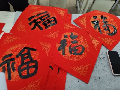 为感受春节愉快气氛、丰富校园文化、展现协会成员水平,书画协会开展送春联迎新春活动。书画协会成员带领同学们屏气凝神、挥毫泼墨,活动现场顿时墨香十足、喜气洋洋。成员们娴熟地写下一副副“龍年吉祥”等手写春联,一并写上一张张字体多样的红底方纸“福”字,将美好真挚的祝福化作寓意吉祥的春联。此次活动老师指导同学们现场制作了约一百件极具美感的书法作品,充分了解书法文化的魅力、体验书法文化带来的乐趣。