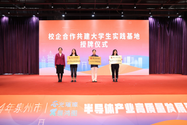 陈秋燕代表学校向泉州三安半导体科技有限公司、福建晶安光电有限公司、福建天电光电有限公司授牌,共建“大学生实践基地”。