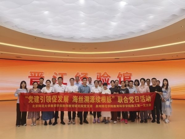 为深入学习贯彻党的二十大关于教育科技人才一体推进的战略部署,全面落实习近平总书记关于教育的重要论述,5月15日,教育科学学院教工第一党支部与北京师范大学教育学部教师教育研究院党支部联合开展“党建引领促发展,海丝溯源续根脉”主题党日活动。来自两个党支部的30余名党员骨干齐聚泉州晋江,通过实地研学、文化溯源、经验互鉴,探索党建与学科深度融合新路径,共绘新时代教育高质量发展蓝图。