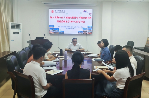 4月21日,学院在449会议室召开深入贯彻中央八项规定精神学习教育读书班暨党委理论学习中心组学习会(第二次)。学习《习近平关于加强党的作风建设论述摘编》和《福建省进一步贯彻落实中央八项规定精神实施办法》并开展交流研讨。学院党委书记蔡志荣主持,学院党委委员、各党支部书记、系、科室(中心)负责人参加。