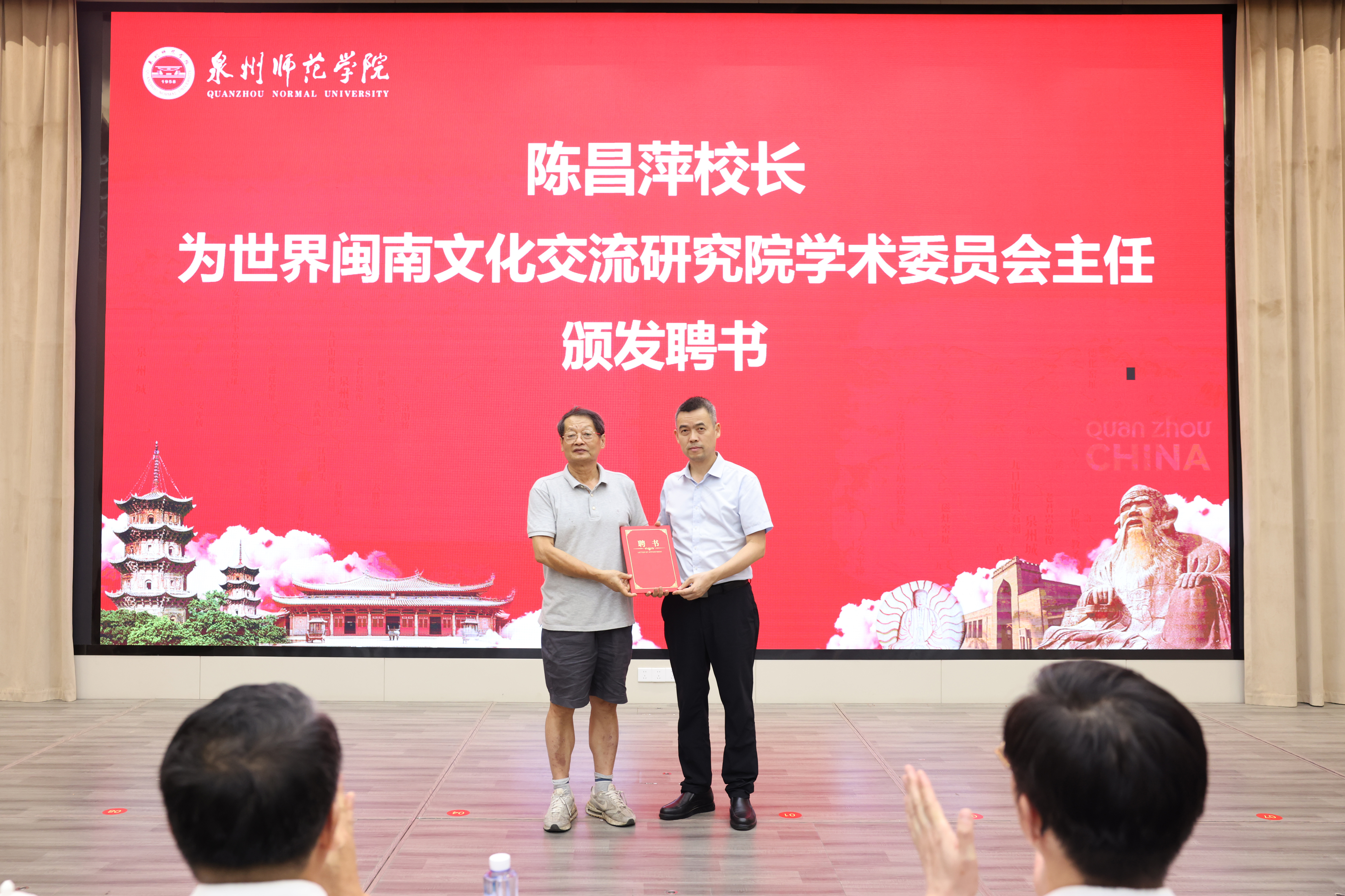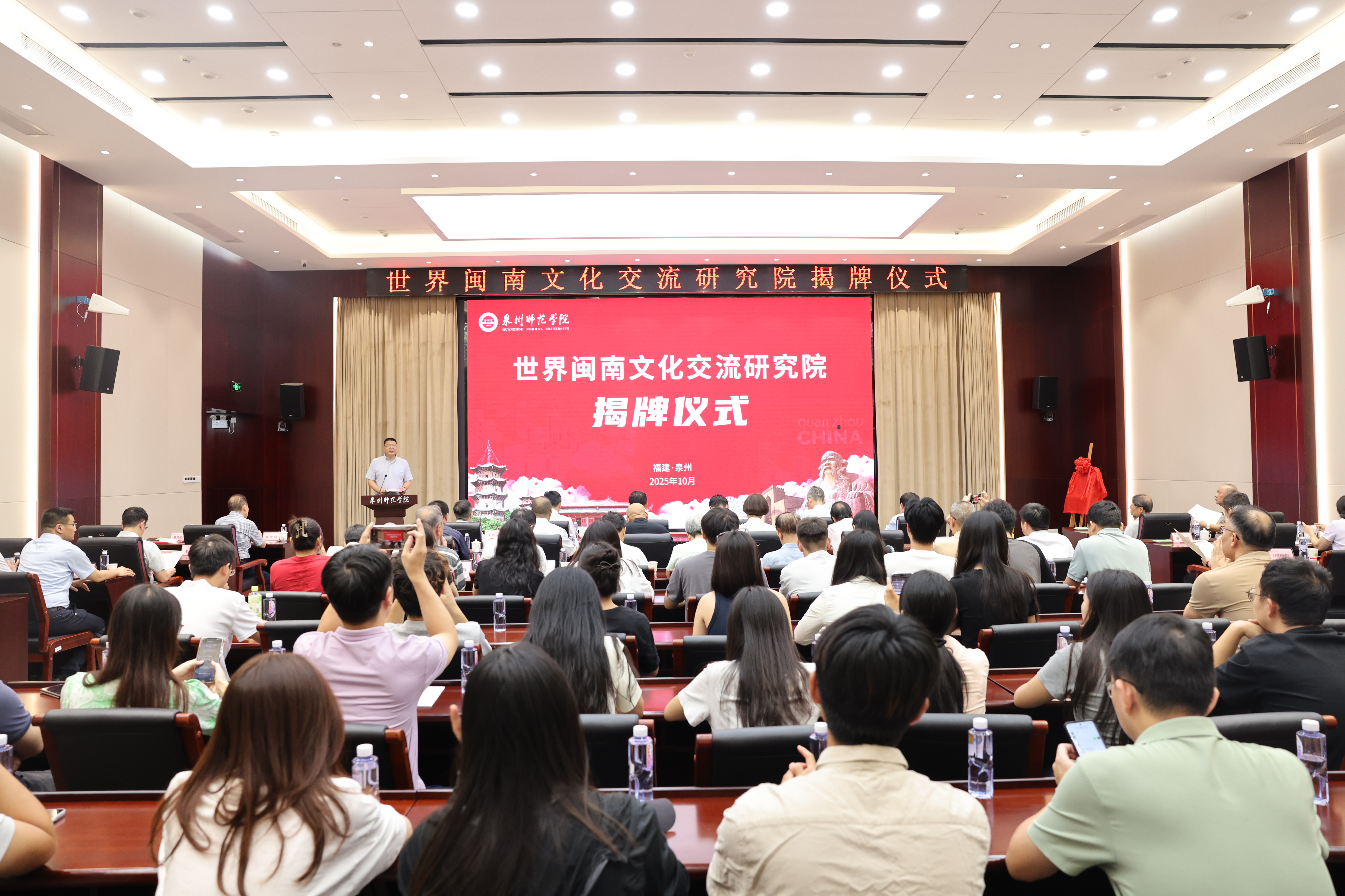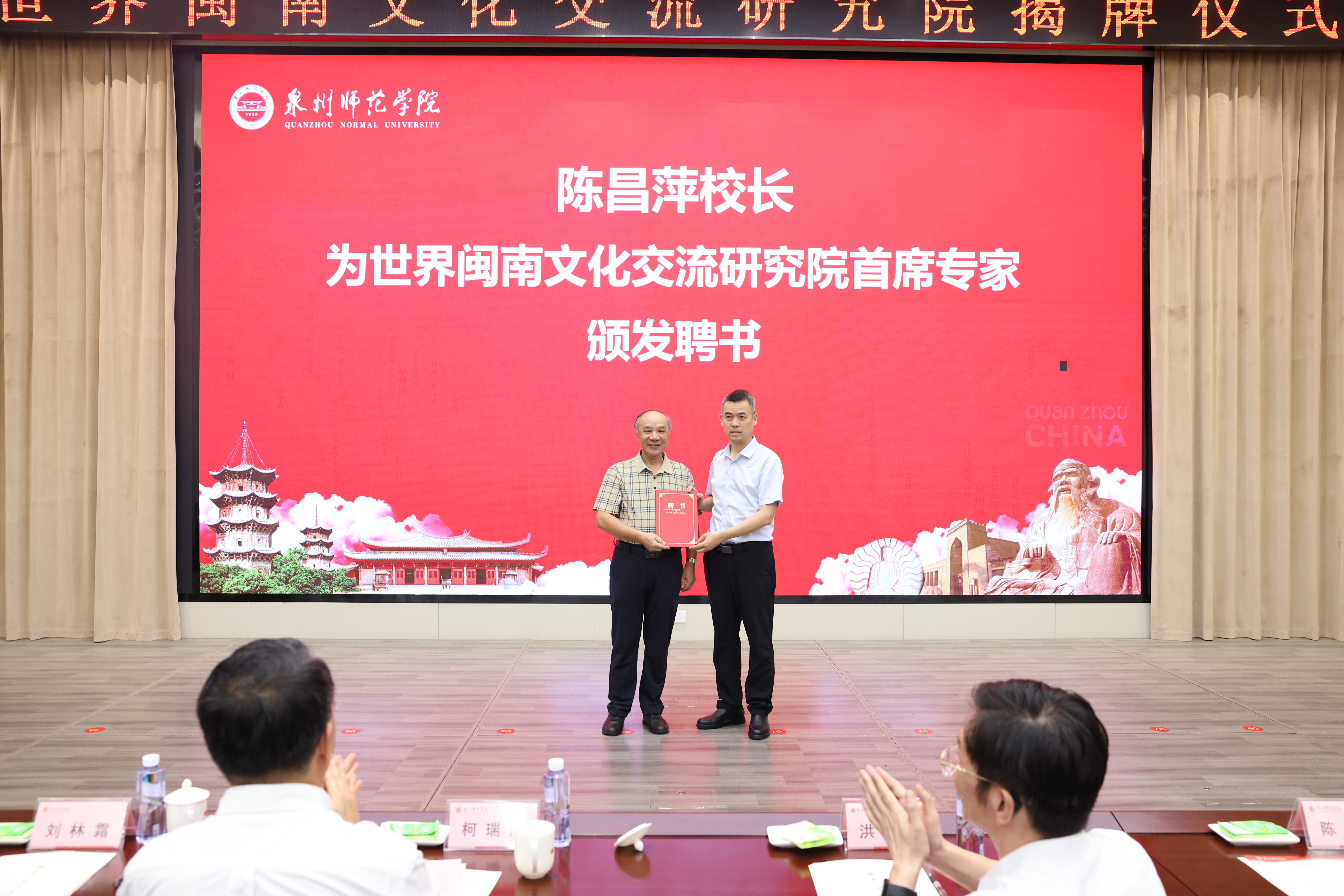 福建省社科联党组成员、专职副主席候选人、秘书长洪金镖,泉州市委常委、宣传部部长、统战部部长刘林霜,泉州市政协原副主席、一级巡视员骆沙鸣,福建省福文化研究院院长马照南,厦门大学国学研究院院长陈支平,福建省闽南文化研究会会长林晓峰,校党委书记柯瑞清、校长陈昌萍、副校长夏侯建兵等出席,学校有关职能部门及二级学院负责人,研究生代表参加仪式。
