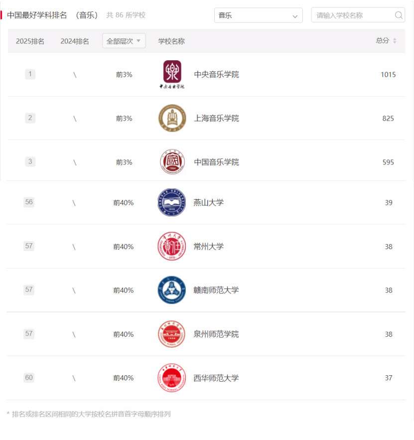 近日,高等教育评价专业机构软科正式发布“2025软科中国最好学科排名”。我校“音乐”学科在所有参评学校中排名层次进入前40%,位居第57名。