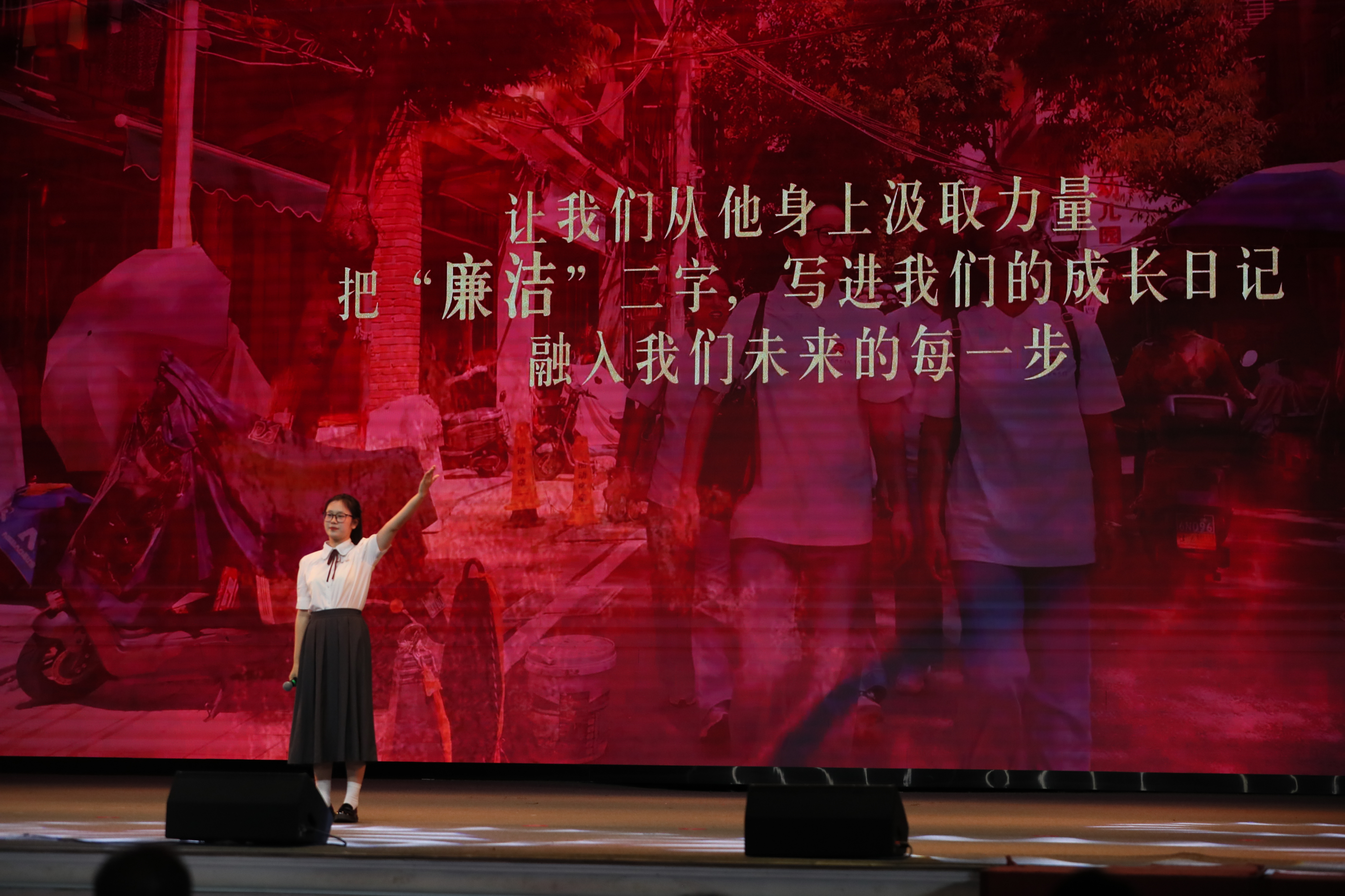 展演活动中,陈思琪同学以生动的语言和鲜活的事例,讲述了明代清官李贽任职期间的清廉事迹,介绍了李贽的廉政思想,揭示了李贽的廉政思想对当代青年大学生的启示,深深打动了现场观众。