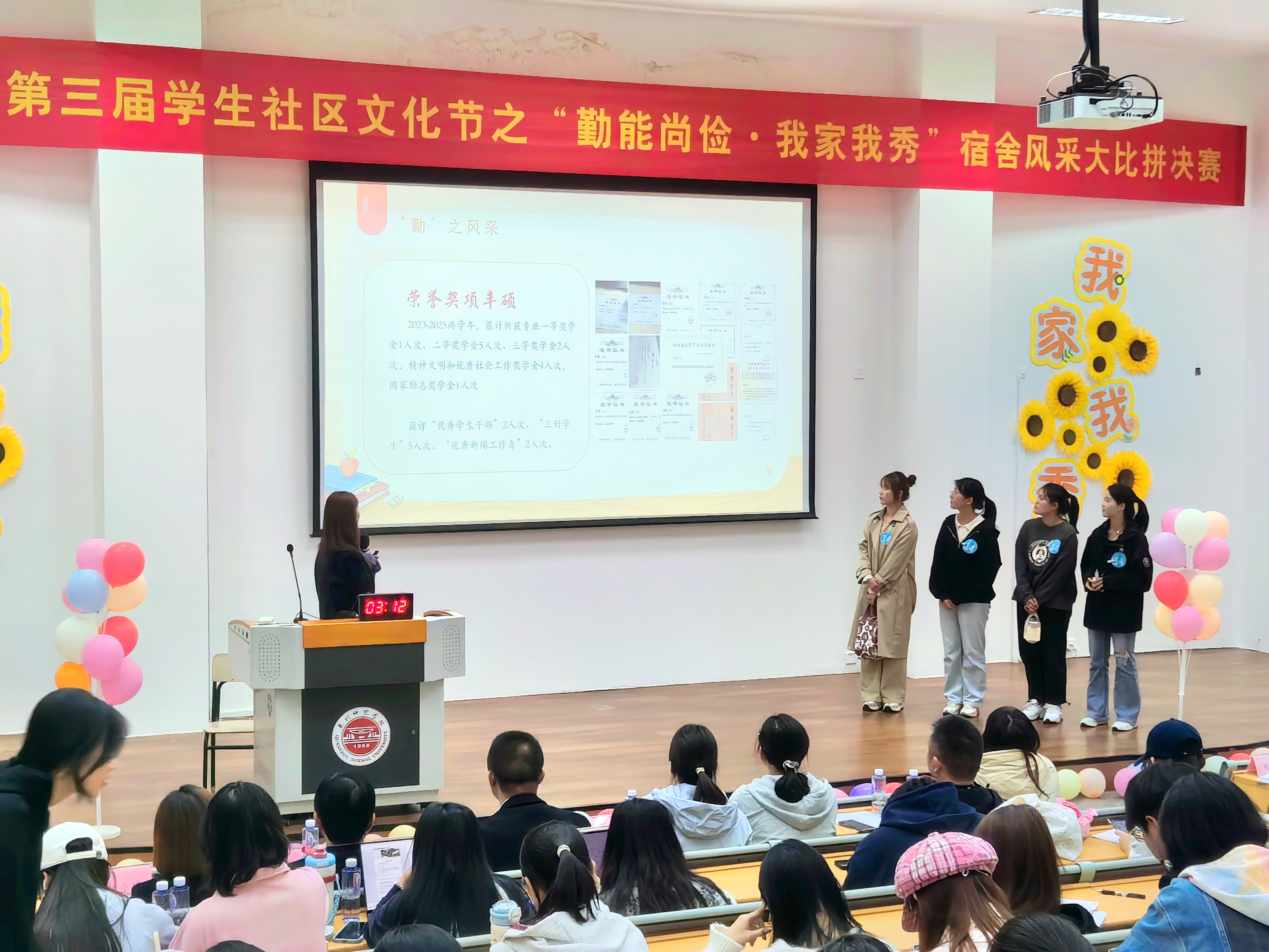 为深入推进学校“温暖集体行动”,加强“一站式”学生社区文化建设,引导学生养成勤俭节约、互助共进的良好习惯,11月27日,我校在中山纪念堂五楼报告厅举办第三届学生社区文化节之“勤能尚俭·我家我秀”宿舍风采大比拼决赛。宣传部、学工部、后勤处、校团委等相关部门教师代表,以及学生社区综合服务中心主管和宿舍管理员代表担任评委,各二级学院(系)320名学生代表到场观摩。
