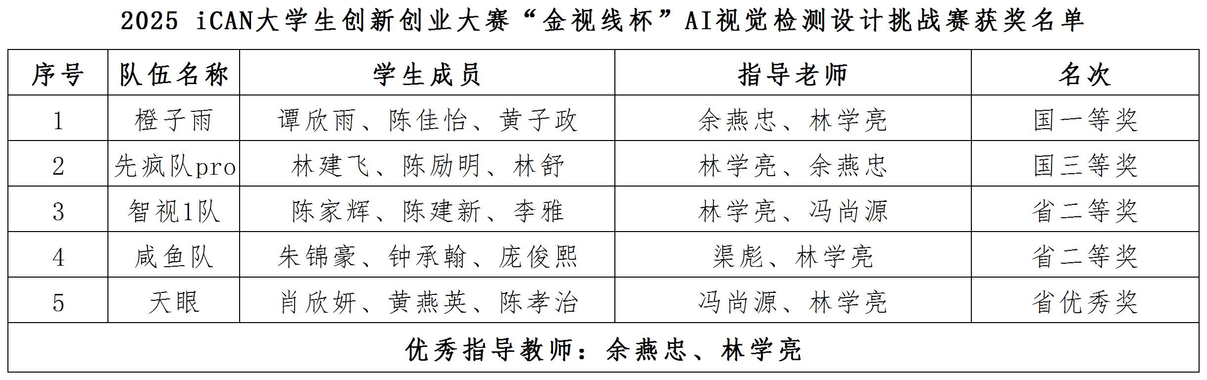 近日,2025年iCAN大学生创新创业大赛“金视线杯”AI视觉检测设计挑战赛全国总决赛在江苏大学圆满落幕。我校光电工程系学子表现亮眼,勇创佳绩。其中,橙子雨队(谭欣雨、陈佳怡、黄子政)获全国一等奖,先疯队pro队(林建飞、陈励明、林舒)获全国三等奖;余燕忠、林学亮获评“优秀指导教师”。
