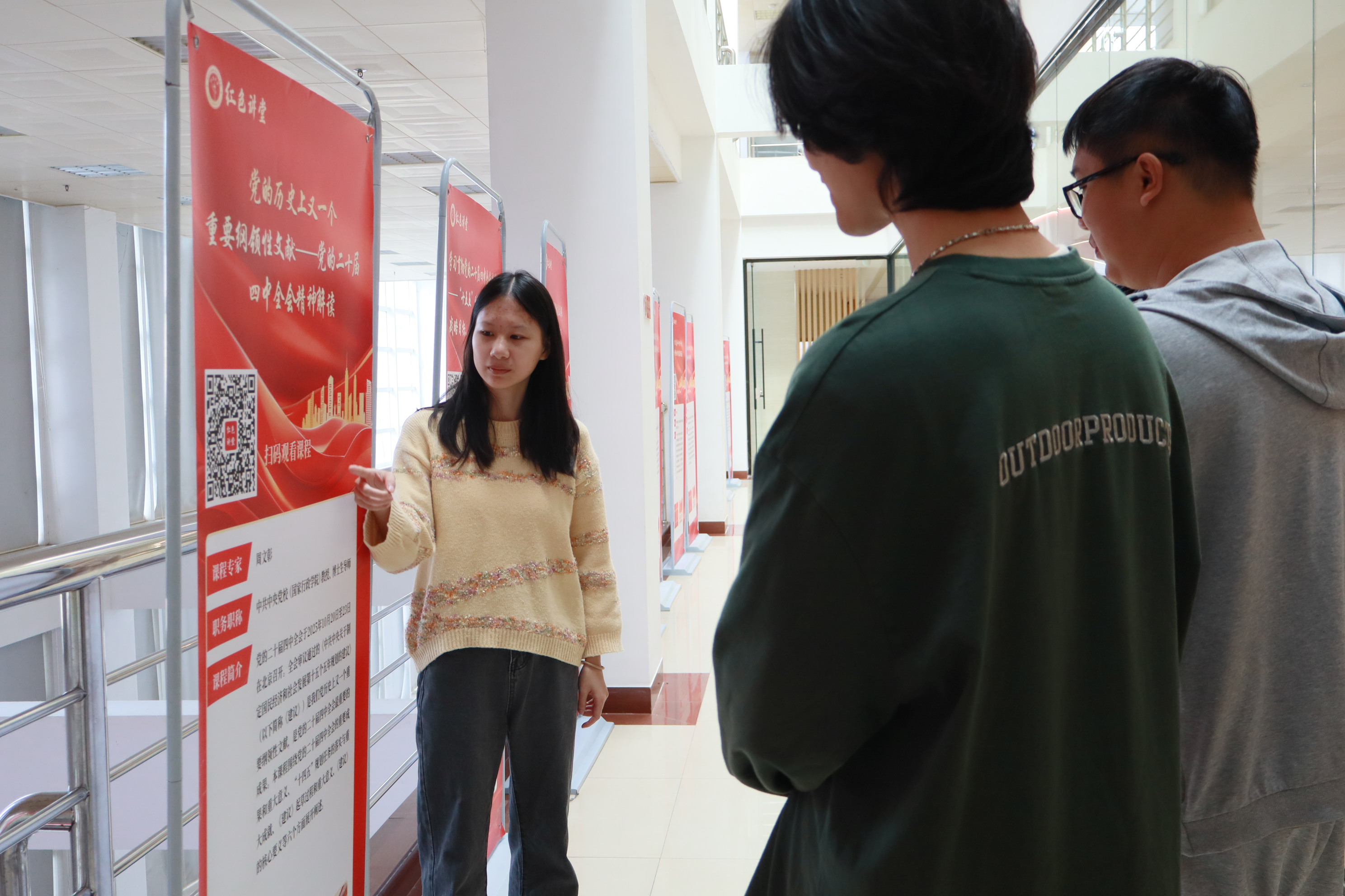 本次活动围绕师生深入学习贯彻党的二十届四中全会精神的需求,着力打造“权威化、数字化、全覆盖”三大特色。一是内容权威,汇集了来自中共中央党校(国家行政学院)、全国政协委员等领域的十位专家,围绕政治、经济、科技、文化等多维度进行系统解读。二是数字形式,将专家讲座精心制作成系列微视频,方便师生扫码收藏、利用碎片时间反复学习,打破了传统学习的时空限制。三是覆盖全面,通过线上线下联动的展览模式,拓宽了学习参与的广度与深度,有力推动了全会精神的广泛传播。