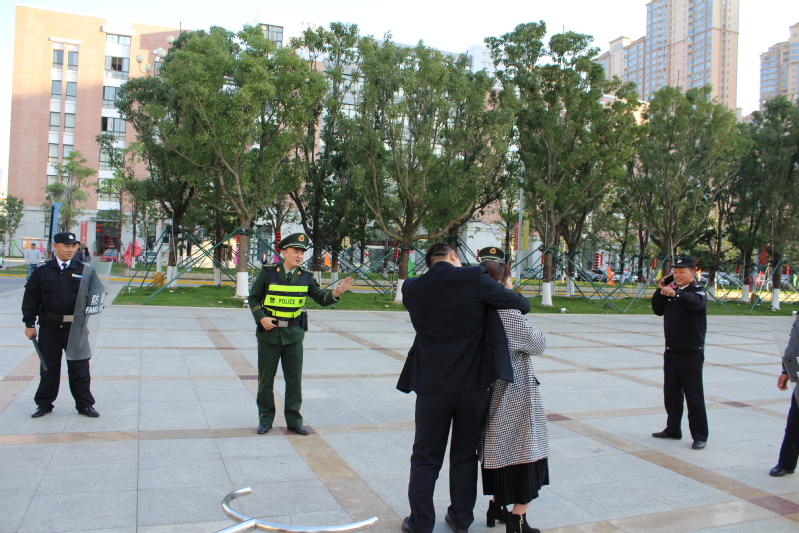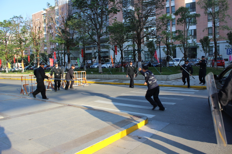 培训会后,所有参加反恐防暴演练的人员集中在特教楼前广场,演练序幕正式拉开。这次演练由三个科目组成。第一个科目是应对爆炸事件疏散演练:校园发生爆炸后,保卫处值班室接到报警后立即通知安保人员赶赴现场,到场安保人员引导师生疏散并在四周设置警戒区和隔离区,严禁无关人员进出现场;医务室对伤员伤情进行初步处理。第二个科目是应对暴力冲撞袭击、刀斧砍杀暴恐袭击事件演练:一校外男子驾车在校大门徘徊,校大门岗安保队员驱离无效后报警,接警后保卫处立即集结安保力量组织实施应急处置行动,安设阻车器,建立警戒圈,阻止暴恐分子进一步行凶,而后联合后渚边防派出所警察共同制服暴恐分子。第三个科目是应对绑架胁持人质事件演练:保卫处接到校大门广场发生胁持人质暴力恐怖事件报警后,立即组织人员携带防卫器械赶赴现场,组织对现场实施警戒,严禁无关人员进出现场,而后联合后渚边防派出所警察共同制服暴恐分子。