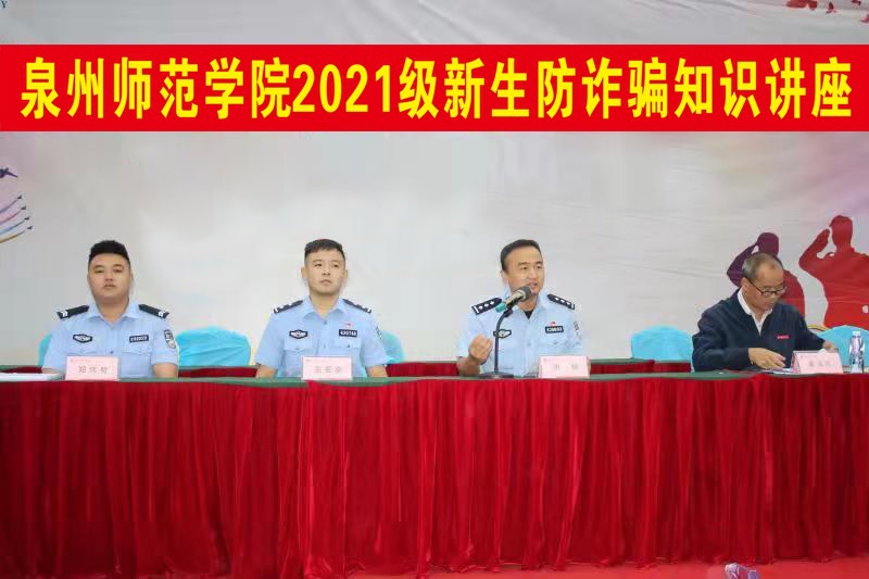 为进一步提高2021级新生防范电信网络诈骗的意识和能力,维护校园和谐稳定,我校于10月21日下午在第一田径运动场举办2021级新生防电信网络诈骗知识讲座,本次讲座由泉州市丰泽公安分局后渚派出所胡杨警官主讲,校党委副书记陈晓风出席,驻校民警翁振南警官、郑玮智警官和2021级全体新生参加。讲座由保卫处处长董清海主持。