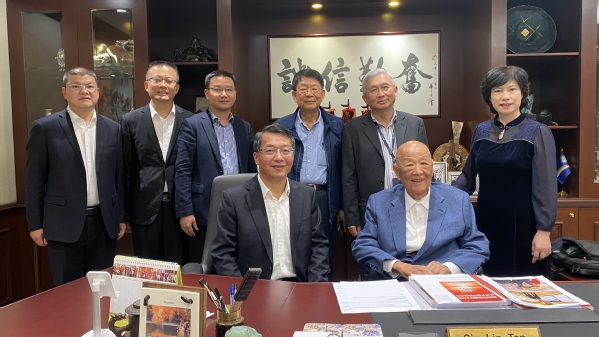 At Luen Thai International Group, the delegation visited the Honorary Chairman of the Board of Directors of QNU, Dr. Tan Siu Lin, accompanied by Li Hexie (Secretary General of Tan Siu Lin Foundation and Executive Vice President of HongKong Renshan Fortune Charity Association) and Chen Weibin (Executive Vice President of Luen Thai Group).