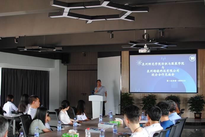 泉州精镁科技有限公司总经理汤瑜带领公司领导班子对学院师生一行的到来表示热烈欢迎,并对公司情况进行了整体介绍。泉州精镁科技有限公司是世界知名针织机械制造商意大利圣东尼(上海)针织机器有限公司子公司,是一家专门设计、生产全系列高精密针织大圆机的数控、智能型科技企业。公司新厂区位于洛江区, 2020年5月启用运营,占地面积43亩,总投资2亿元,拥有专门的研发中心和高精密的检测中心。公司定位为智能制造型科技企业,通过吸收和培养一批圆机行业高端技术人才,开发先进的圆机制造技术和高标准的加工工艺,已发展成为行业佼佼者,不仅被评为“科技小巨人企业”和“数控一代企业”,而且是中国纺织机械协会圆纬机行业分会的会长单位,参与制定多项国标和行业标准。