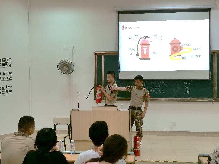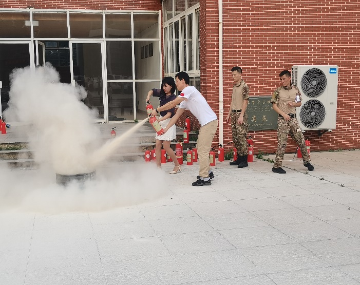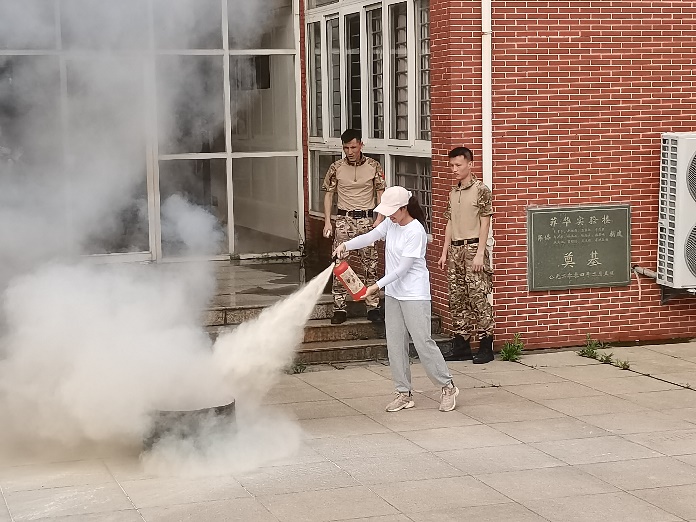 为模拟真实情景,本次演练场地爱约楼六层使用消防烟雾。全体演练学生均严肃对待,学院老师和教官迅速就位,同学们弯腰猫步,用湿毛巾捂住口鼻,沿着学院指定楼梯口靠墙快速有序地撤离教学楼,到达指定避难场所爱约楼一层的空地处。到达指定避难场所后,在学院老师和教官的指挥下,各个班级有序清点人数,并逐级进行汇报,确保全体师生的安全。而后,教官向同学们真实演示灭火器是如何扑灭火源,各班委依次上前学习使用。