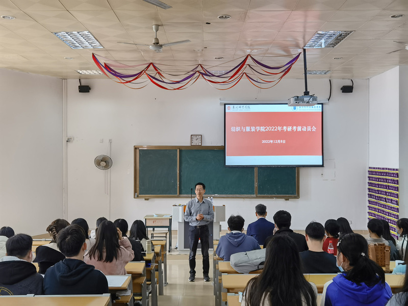 12月8日中午,纺织与服装学院在荣助梯教212举行2022年考研考前动员会。全体考研学生参加,院长邱夷平主讲,党委书记黄国波主持。