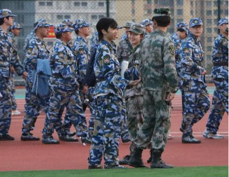 在手语操方阵中,训练严谨而细致。相对于其它方阵刚劲有力的操练,手语操表演显得相对柔美。同学们从最基本的动作学起,教官不断将音乐暂停,逐字逐句,倾心讲授,细抠动作。手指的弧度、手腕的力度、手臂的高度都要求精准到位,整体效果干净利落又不失温婉柔和。同学们以一个个标准且优美的手语动作,向大家展示了一腔报国之心、强国之志。