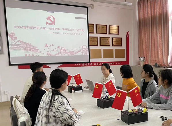 5月20日,研究生党支部书记张亚丽围绕“学党纪筑牢规矩‘防火墙’, 使守纪律、讲规矩成为行动自觉”主题,详细阐述了党的“六大纪律”,并结合支部党员实际,提出了遵守党纪党规和提升工作学习的要求。她强调,党员需深入学习《条例》,将其内化为自我追求,使学习党纪的过程成为增强纪律意识和提高党性的过程。