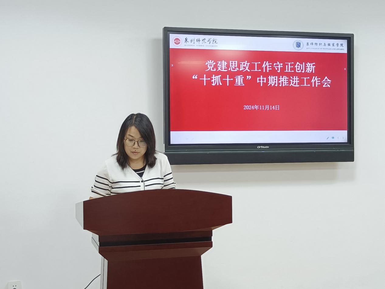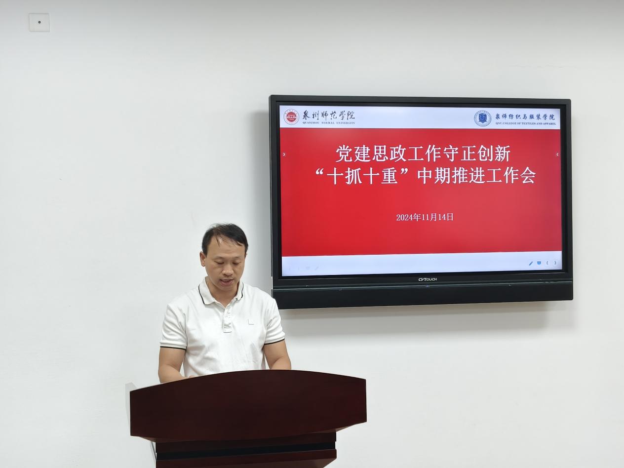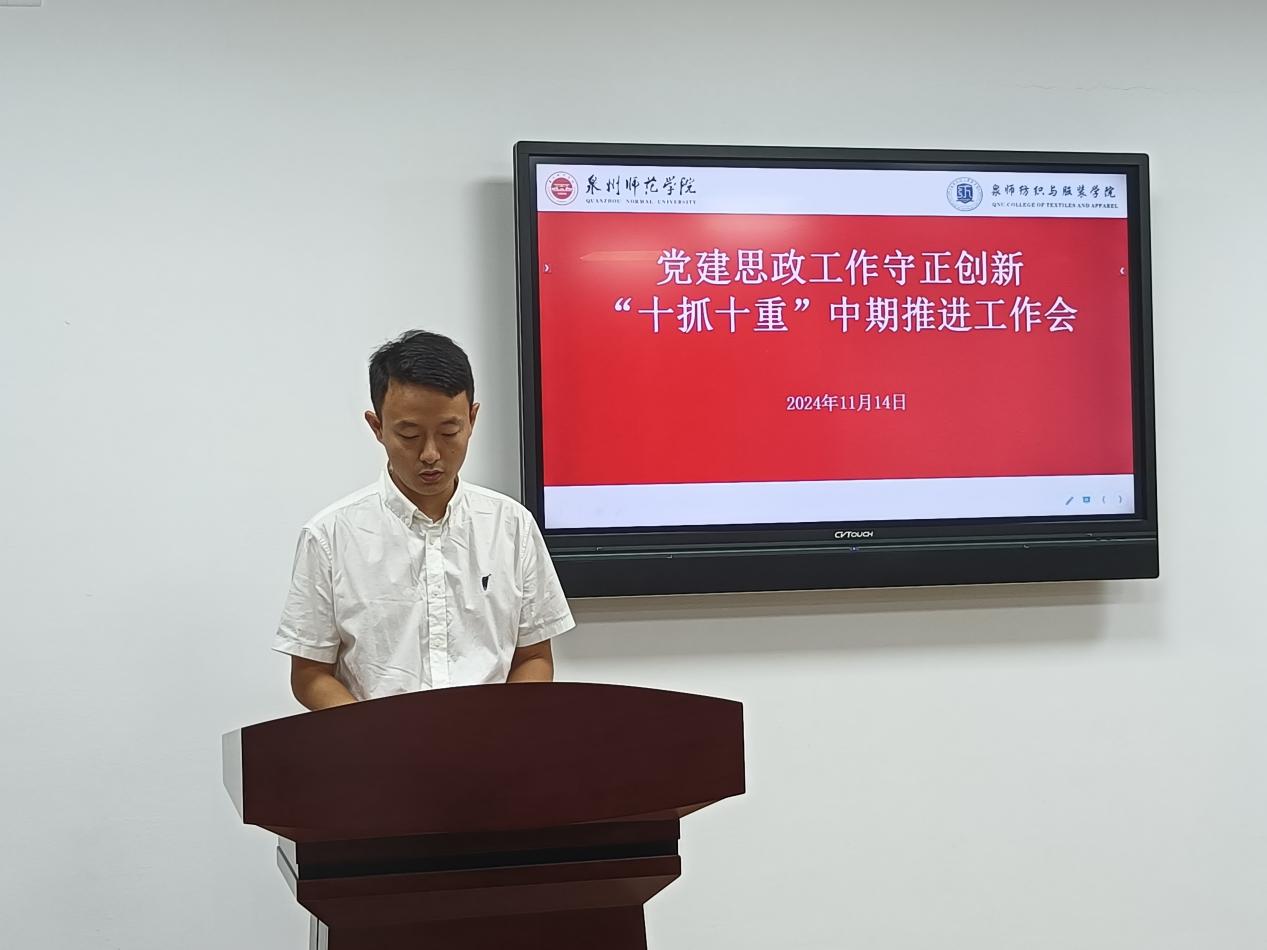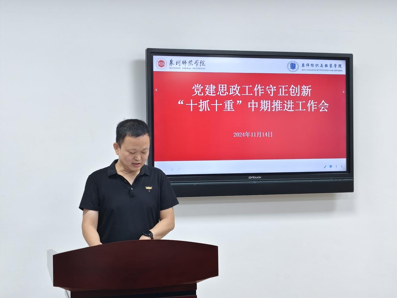 11月14日上午,纺织与服装学院在王爱约楼701会议室召开推进党建和思政工作守正创新“十抓十重”中期工作推进会,深入学习贯彻习近平总书记关于高校党的建设和思想政治工作的重要论述,研究推动党建思政质量创优提升。学院党委书记黄国波主持会议。党委委员、副院长徐海燕,党支部书记,各系(办)负责人,全体辅导员,学生干部代表参加。