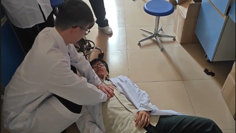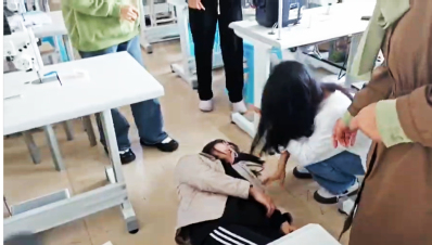 案例一:学生触电昏厥处理模拟。学生在服装缝制工艺室内意外昏迷倒地,现场同学发现后立即通知老师,老师发现设备有轻微漏电,迅速切断电源,现场同学大声呼喊触电者名字,触电者醒来随后被扶起坐椅等待观察,并现场请医务人员检查触电学生身体。