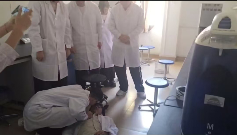 案例二:学生意外触电失去意识处理模拟。学生在微纳米纤维材料制备实验室内,因误触电源插头失去意识摔倒倒地,同实验室同学1发现后立即切断电源、通知老师;同学2蹲下用双手拍打触电者双肩,并贴耳大声呼叫其名字无反应,即对触电者进行人工呼吸和心肺复苏等紧急救治;同时,同学3拨打校园“120”医务急救和“110”报警电话,相应部门与人员接到险情后及时赶到现场进行处理。