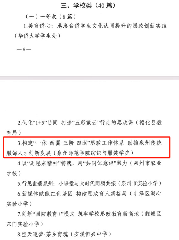 近日,泉州市委宣传部公布2025年泉州市思想政治工作创新案例评审结果,纺织与服装学院报送的案例《构建“一体·两翼·三阶·四驱”思政工作体系 助推泉州传统服饰人才创新发展》获评学校类一等奖。