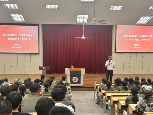9月15日晚上,纺织与服装学院在中山三楼学术报告厅举办2025级本科新生“开学第一课”,学院党委书记黄国波以“涵养家国情怀,争做有为青年”为题为大一新生授课。
