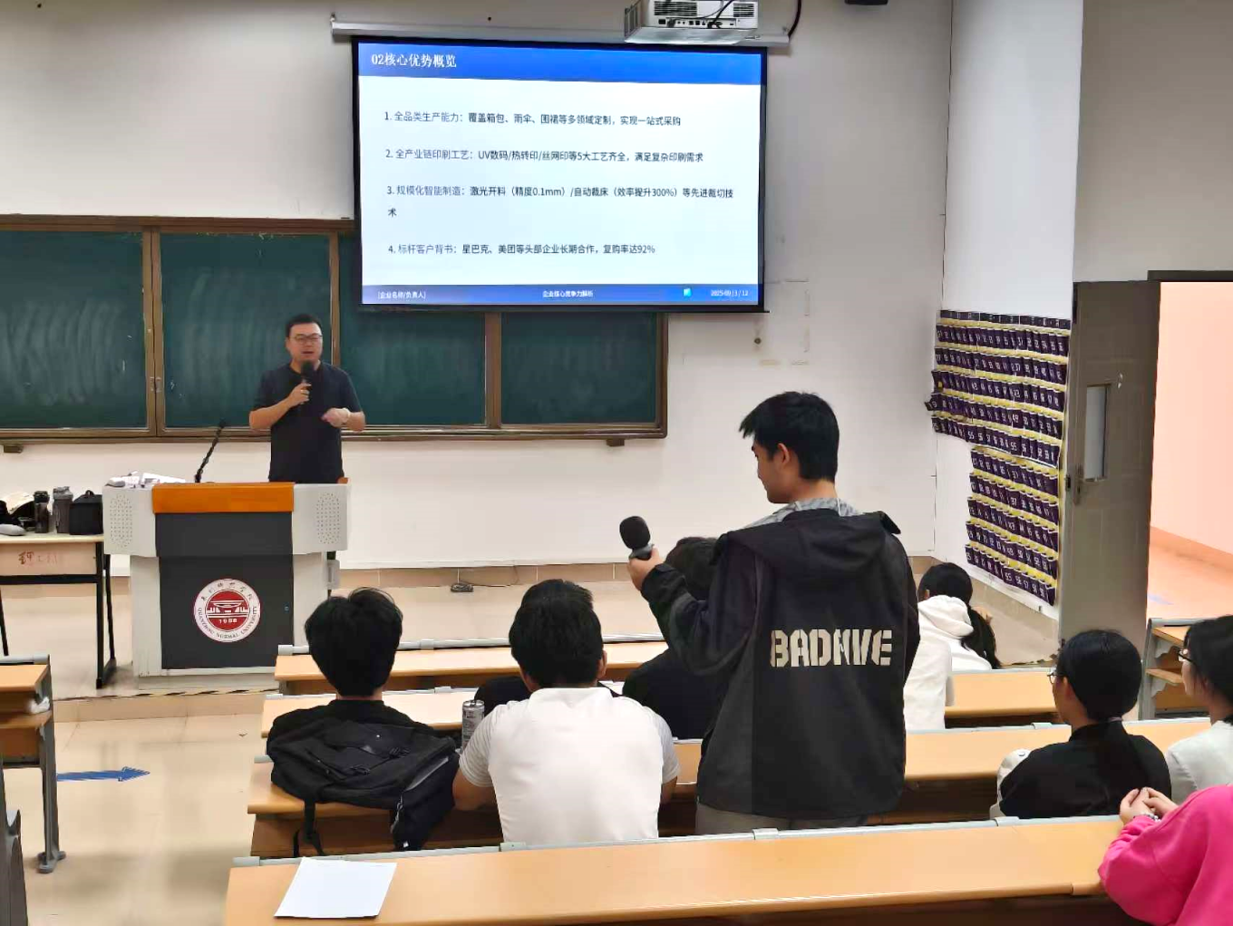 在互动交流环节,学弟学妹们积极提问,围绕“纺织工程专业的职业前景”“专业考研与就业的选择”“跨境电商所需准备”以及“当前经济形势下电商行业的入行建议”等话题与张瀚允展开深入交流。他勉励在场同学:“要对行业充满信心,保持谦逊好学的心态,沉下心来,积累经验,脚踏实地朝着目标迈进,未来必将大有可为。” 张瀚允以真实的成长经历与务实的人生建议,为纺织工程专业同学们带来了一堂生动而深刻的择业与创业启蒙课,进一步增强了同学们对专业前景的信心与对个人发展的思考。