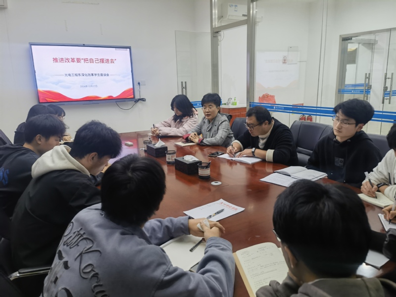 2024年12月17日晚上,光电工程系党总支书记林蕙琼,辅导员柯世池与学院各学生组织负责人、各班班长、团支书等学生代表,在千墅501会议室围绕“推进改革要‘把自己摆进去’”主题举行了一场深入的座谈会。