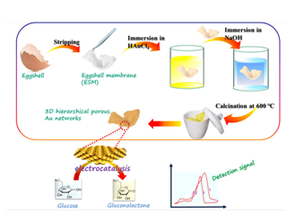 葡萄糖含量的分析与测定对食品、生物化工和环境科学等具有重要的意义,血糖水平更是医学上衡量人体新陈代谢能力和糖尿病临床诊断的重要指标。我校化工与材料学院钟树林同学,在杨大鹏教授和庄君阳博士的指导下,巧妙地利用废弃鸡蛋壳膜的结构(层级、多孔)和化学(蛋白质组成)特点,将其转化成具有三维空间网状结构的多孔金纳米薄膜。该材料遗传了蛋壳膜本身结构的特点,特别适用于构建葡萄糖无酶传感器电极,可在0.1 v的低电压下进行驱动,展现了出色的葡萄糖检测性能,并具有低检测限(0.2µM)、快速响应时间(小于2s))等优势,不但有重要的理论意义,还具有广泛的实用前景。