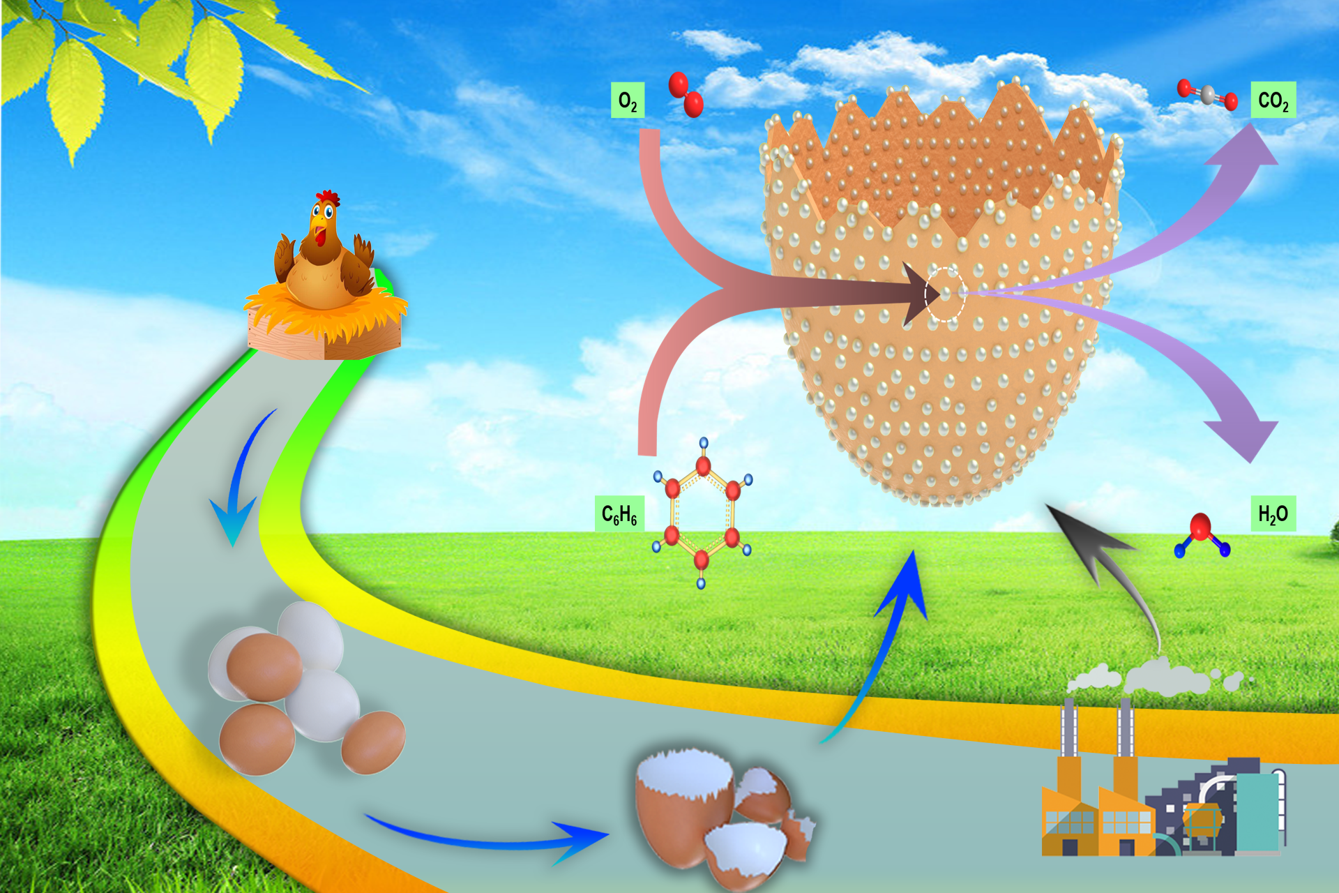 图2 鸡蛋壳模板合成的CaCO3-Ag复合材料用于VOCs处理的示意图
