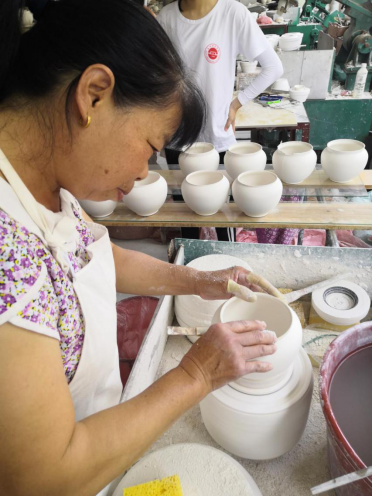 实践队师生参观了德化陶瓷博物馆、顺美陶瓷文化生活馆、如瓷文化生活馆、陶瓷街和中国茶具城,走进泉州工艺美术职业学院,了解到德化陶瓷产业的发展现状与历史,以及德化白瓷在日用品、工艺品上的传承与创新。德化白瓷历史悠久,兴于唐宋,盛于明清,瓷质致密,色泽光润明亮,有“猪油白”、“象牙白”之称,被法国人成为“中国白”,有“世界白瓷之母”、“世界白瓷看中国,中国白瓷看德化”的美誉。实践队还参观了中国陶瓷艺术大师、中国非遗保护项目德化瓷烧制技艺代表性传承人、中国瓷塑“弥勒王”邱双炯大师的凤凰陶瓷研究所,中国陶瓷艺术大师许瑞峰为纪念其父亲许兴泰先生所创办泰峰陶瓷艺术馆以及中国工艺美术大师兼中国陶瓷艺术大师陈明良的明玉陶瓷研究所,大师们的作品惟妙惟肖、栩栩如生,给人极大的视觉震撼和艺术熏陶,陈明良大师更是为实践队讲解了德化的陶瓷发展史以及流派传承。为了更好地了解德化陶瓷技艺薪火相传的历史,探秘古窑柴烧,寻找古陶瓷之源,实践队参观了屈斗宫古窑址和月记窑。其间,实践队还参观了厚德陶瓷厂、青年陶瓷创作者工作室,观看陶瓷拉胚、修坯、上釉、贴花、烧制等制作流程,并了解县政府在促进陶瓷产业发展上给予陶瓷厂商和青年创作者的相关政策。最后,实践队采访了德化县陶瓷发展委员会办公室干部寇婉琼等,了解县政府对陶瓷产业的发展规划和传统文化的传承与宣传推广措施。