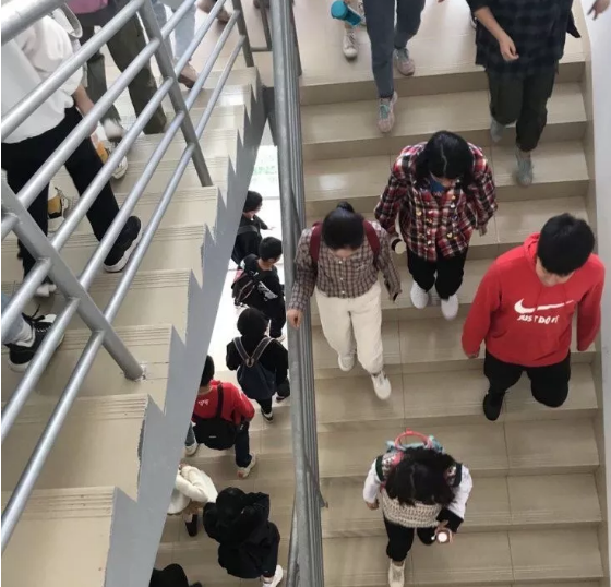 中午12点15分,全体同学分别在理工楼三楼、四楼、五楼走廊集合完毕。12点25分,哨声响起,同学们开始从就近的楼梯口迅速撤离到三楼,再经过319教室有序地撤离到邱季端实验楼前。