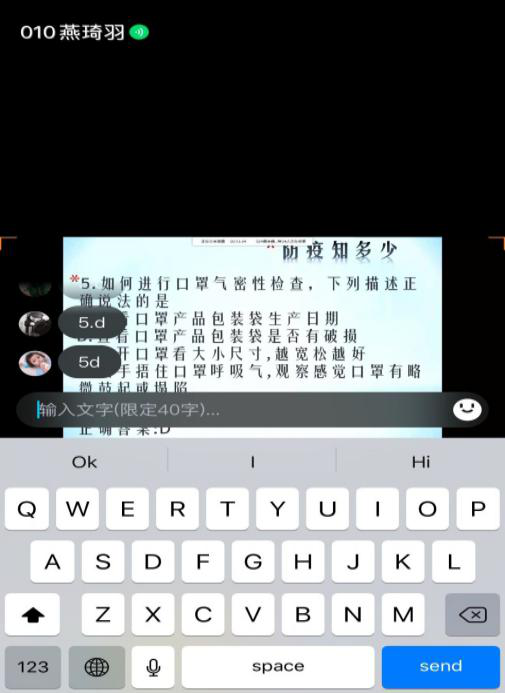 直播间内,各班以疫情期间创作的歌曲开场,围绕“凝聚青春正能量,众志成城抗疫情”的主题分享有关新冠肺炎防控知识视频,普及正确洗手步骤、规范佩戴口罩等防护相关知识,保证切实掌握病毒防范措施;并开展了“防疫知多少”的问答竞赛,在活跃欢快的氛围下,同学们积极抢答、收获知识,进一步了解了新型冠状病毒防范有关知识。