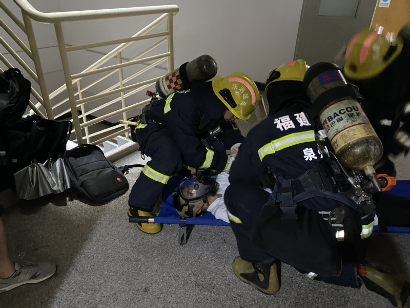 15:30分烟雾弹被点燃,疏散演练正式开始,在警报声中,陈昭情实验楼里的同学们用毛巾掩住口鼻,迅速跑出实验室,并在指挥员和疏散引导员的引导下,按照指定路线有序疏散至陈昭情实验楼六楼门厅前空地,各班清点人数无误后集中到宝龙实验楼前广场。15:35分丰泽区消防大队东海中队消防人员到位,开始灭火和人员抢救,将受伤人员抢救到急救点进行急救。