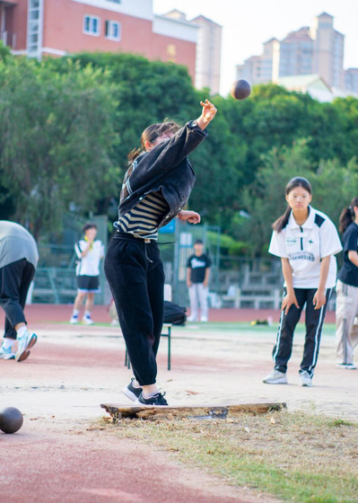 铅球是一项对力量和技巧都要求极高的运动,既要求运动员具备极强的爆发力,又需要运动员具有一定的腰腹协调性。一次次的投掷训练只为了不断刷新自己投掷的最远距离,只为了划出那一道最优美的弧线。蔡楚楚同学表示,这次运动会是一次机会,既然我抓住了这次机会,我一定全力以赴,在运动会的赛场上展现更好的自己。
