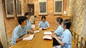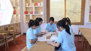 图19 实践队在石狮廉洁文化教育馆内品读廉洁家风家训书画作品图20 实践队在石狮市华山古民居家风家训馆学习室内开展交流讨论