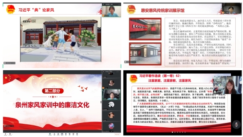 7月10日至15日,为推动思政小课堂和社会大课堂有机融合,调研结束后,实践队开展了宣讲课集体备课会。在指导教师的带领下,实践队充分挖掘本次实践中的思政元素,依托可看、可闻、可触的生动素材,共同研讨如何以优良家风涵养廉洁文化的理论要点。从家风家训的内涵及价值、泉州家风家训中的廉洁文化、争做新时代廉洁文化的践行者三个方面进行宣讲内容设计。线上开展化工学院班级宣讲,线下走进丰泽区滨海社区、惠安县里春村等地进行宣讲,共计20余场,覆盖700多人。实践队通过李光地、张岳等生动案例阐述了家风家训在塑造个人品德、传承廉洁文化中的重要作用,将大道理转化为小故事,用“青言青语”“童言童语”让宣讲“接地气”“冒热气”,进一步推动廉洁文化遍地开花。