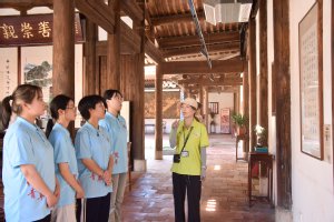 图13 讲解员带领实践队学习家风家训馆内的廉洁家风家训 图14 讲解员在蔡氏家庙前为实践队讲解蔡氏楹联的内涵