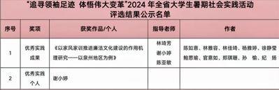 10月8日,中共福建省委教育工作委员会公布了“追寻领袖足迹 体悟伟大变革”2024年全省大学生暑期社会实践活动评选结果。化工与材料学院谢小婷老师获评“优秀实践个人”,实践队调研报告《以家风家训推进廉洁文化建设的作用机理研究——以泉州地区为例》(陈如意、林雅容、林佳琦、杨雅婷、徐静莹、鲍思瑜、官意如、郑琪珊、孙愉、纪扬)获“优秀实践成果”。