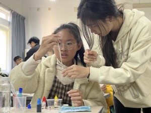 在油水烟花实验环节,实践队员先是以通俗易懂的方式为小记者们阐释春节烟花燃放蕴含的化学原理,让他们知道原来生活中的诸多现象都可以用化学原理来解释。活动现场不能燃放于空中绽放绚烂色彩的烟花,却可以用另一种化学原理将烟花在小小的溶剂瓶中实现。基于油和水不相溶以及相似相溶的特性,实践队员解释道,色素会选择性地溶于油中,且由于油和水的密度差异,当把混合了色素的油倒入水中时,色素随着油滴下沉并在水中扩散,如同烟花在空中绽放般绚烂。在队员们的悉心指导下,小记者们全神贯注地操作实验器具,当看到自己亲手打造的“烟花” 在水中绚烂盛开的那一刻,他们的眼中闪烁着兴奋与好奇的光芒,对化学的兴趣也在这一瞬间被点燃。