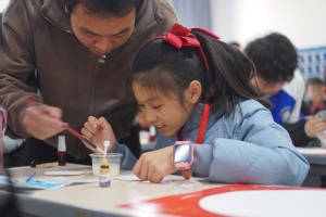 化学实验环节更是将气氛推向高潮。在化学创意春联制作环节,实践队员先是绘声绘色地向小记者们讲述春联及“倒福” 文化的悠久历史渊源,然后向小记者们详细讲解淀粉遇碘变蓝的奇妙化学原理以及如何运用化学原理制作创意春联。在制作过程中,小记者们个个聚精会神,手持毛笔,蘸取淀粉溶液,有的小记者认真地书写着饱含自己美好祝愿的语句,有的小记者脑洞大开描绘了各种各样的图案。待字迹晾干,再用碘酒喷洒,看着蓝色的字迹逐渐显现,他们惊叹于化学的神奇魔力,也深刻感受到传统文化与化学知识结合所带来的独特魅力。