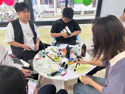 “静蓝心笺——蓝晒书签”活动区域同样人气十足。同学们在了解蓝晒原理后,亲手制作心仪的书签。大家将精心设计的图案放置在蓝晒纸上,经过阳光的照射与药水的冲洗,一张张富有个性的蓝晒书签逐渐成型。同学们纷纷表示,通过制作书签,体验到了传统工艺的魅力,同时也在专注创作的过程中获得了内心的平静。