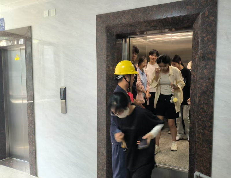 演练开始前,工作人员向学生强调遇到乘梯被困要“保持冷静、切勿扒门、及时呼救”,并演示了电梯一键报警装置的使用流程。本次演练模拟了电梯紧急停梯、电梯困人、故障解除等场景和一键对讲报警、心理安抚等实操。