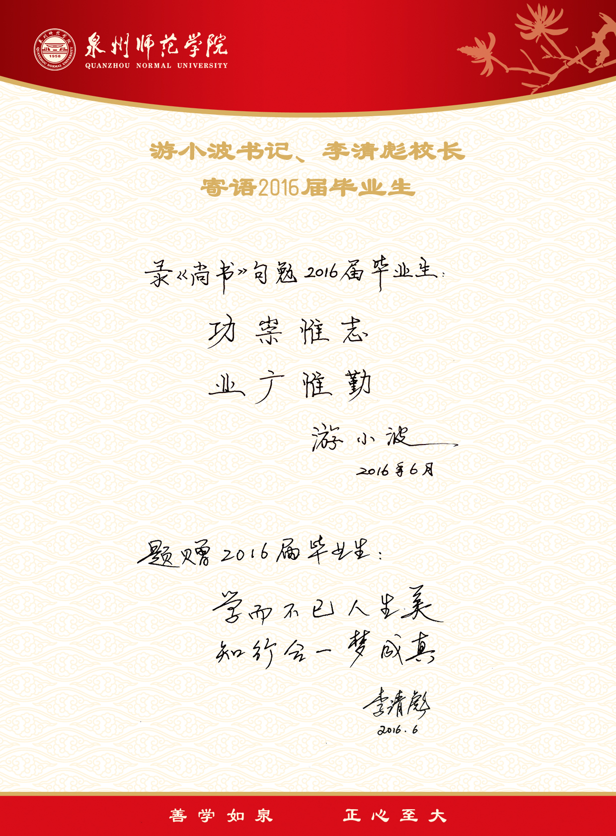 游小波书记、李清彪校长寄语2016届毕业生