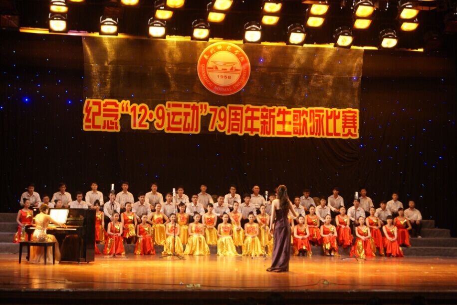 12月11日下午两点半,由校团委、学生会承办的第22届校园文化艺术节开幕式暨纪念“12.9运动”79周年新生合唱比赛在陈祖昌大礼堂隆重举行。校领导游小波、李清彪等人出席了本次比赛。