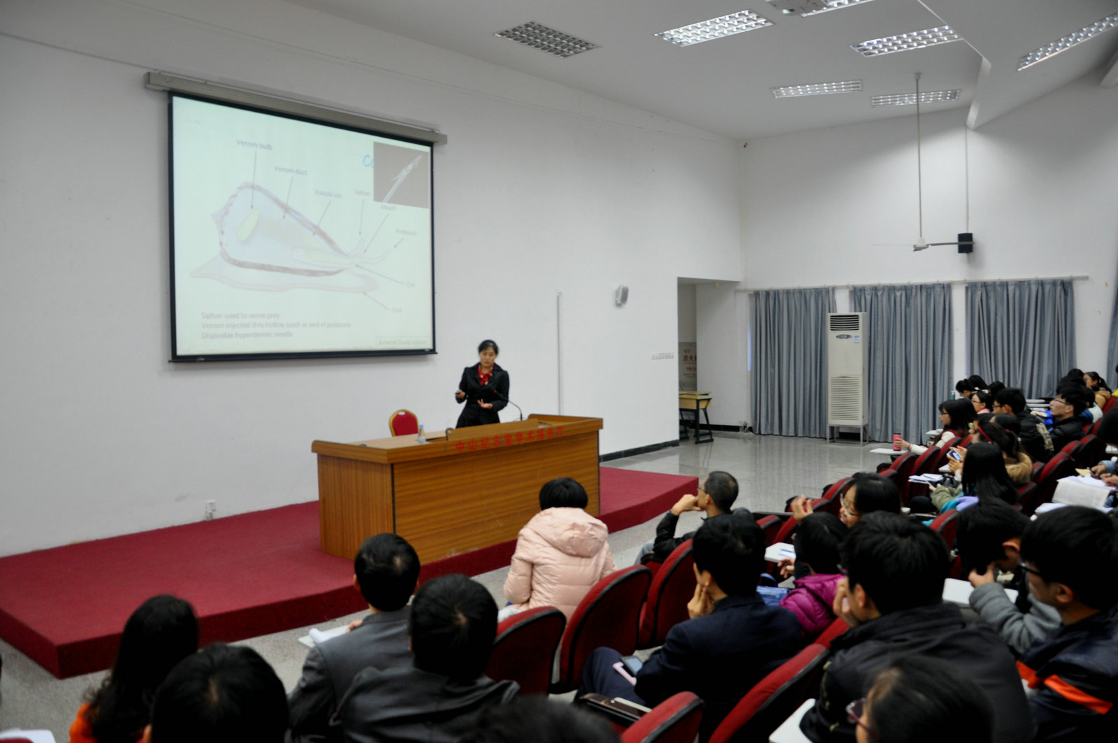 报告会上,罗素兰博士首先介绍了世界海洋药物的研究概况、芋螺毒素及其关键作用靶点--乙酰胆碱受体。接着她进一步结合自己的研究成果,重点介绍了6种海南产芋螺毒素的结构、作用机制和临床用途。最后,她对海洋药物的研发进行了展望。