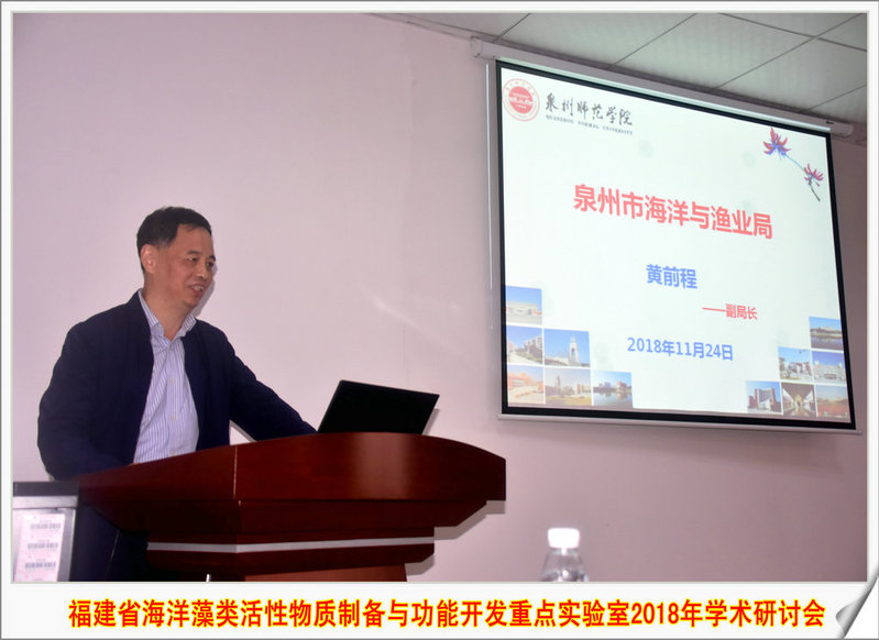 24日,“福建省海洋藻类活性物质制备与功能开发重点实验室”2018年学术研讨会在宝龙实验楼449会议室正式召开。英国威廉希尔公司官网科研处处长戴聪杰教授代表学校表达了对学院发展和重点实验室建设的支持。泉州市海洋渔业局黄前程副局长出席了本次会议,并为学院重点实验室建设和发展提供了各方面支持,同时大力促进了地方校企合作。重点实验室负责人戴聪杰教授对“福建省海洋藻类活性物质制备与功能开发重点实验室”进行了工作总结及来年计划的汇报。福建农林大学副校长郑宝东教授作了题为“海藻高值化加工技术的研究与开发”的专题报告,对海藻深加工技术进行了简要介绍,并对低熔点琼脂制备、海藻新型糖类功效因子结构特征及功能解析等内容进行了分享。在报告结尾,郑副校长也对重点实验室的建设提出了“必须以学科为支撑,争取申请硕士点,可先申请专业硕士点”等宝贵建议。