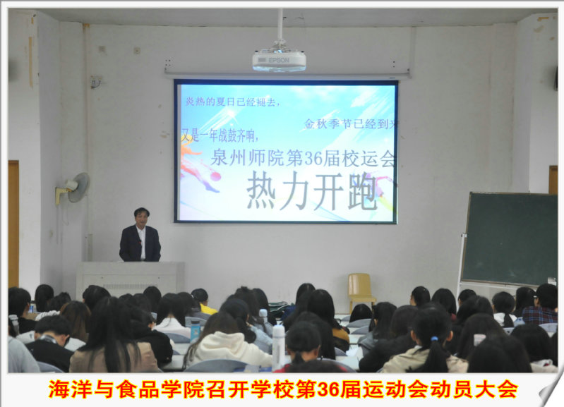 大会开始,蔡英卿表达了对第36届校运会的期待,并且希望此届校运会各位运动员都能发挥出自己最好的水平取得好成绩为学院争光。会上,书记首先给各位与会人员展示了历届校运会我院运动员的精彩瞬间,强调了校运会期间,各位运动员一定要调整好个人状态,以积极认真的态度,充分发挥自我潜力,刻苦训练,争取取得优异的成绩。接着,蔡英卿在会议上表示,校运会的顺利进行需要学院学生会各个部门积极参与,并且就各个部门的任务进行了分配,他强调为了使校运会各方面工作能够顺利的进行各部门一定要协调管理好自己的任务,按时保质保量的完成。他还交代了校运会期间各位同学需要注意的事项。大会接近尾声,书记开始为我院各位运动员加油鼓气,希望各位运动员能够在顽强的拼搏的同时做好自我保护工作,让自己的潜能发挥到最大值,展现出当代大学生朝气蓬勃、奋发向上和勇于挑战自我的精神风貌。